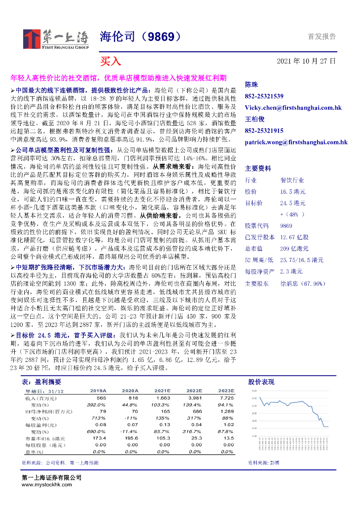 第一上海证券:海伦司(09869)港股公司研究报告-年轻人高性价比的社交酒馆,优质单店模型助推进入快速发展红利期.pdf
