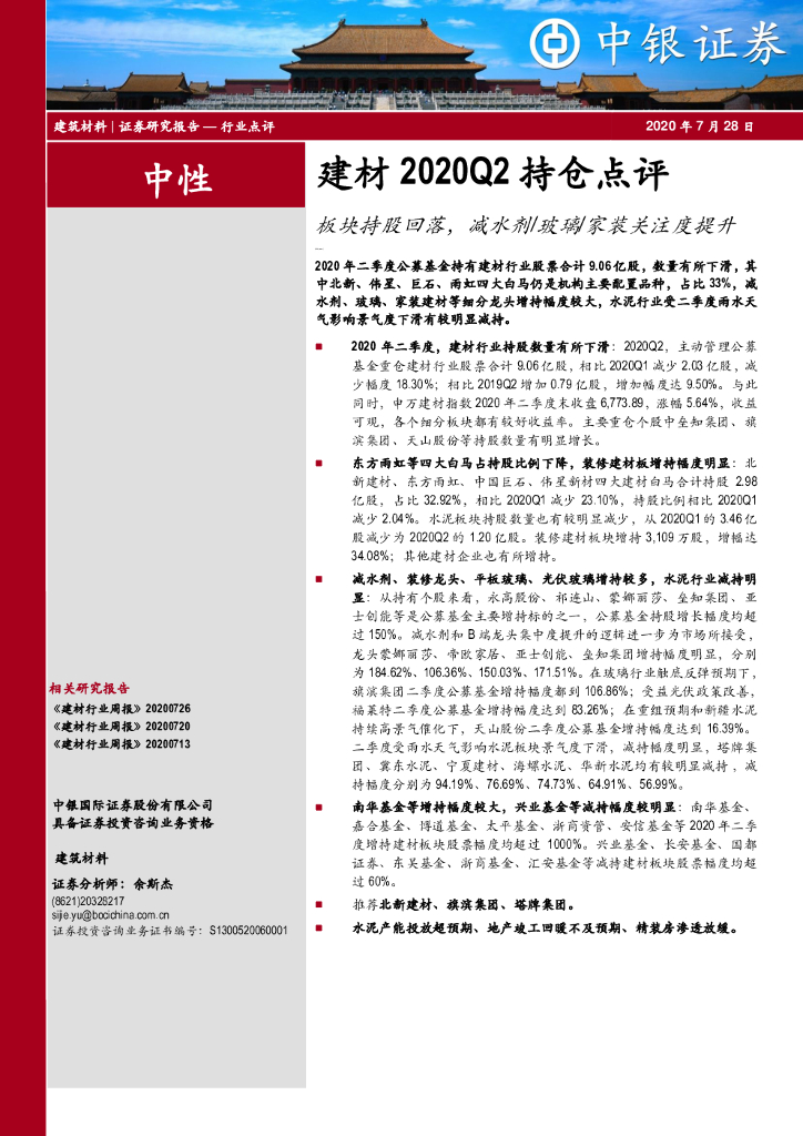 中银证券:建材2020Q2持仓点评:板块持股回落,减水剂玻璃家装关注度提升.pdf