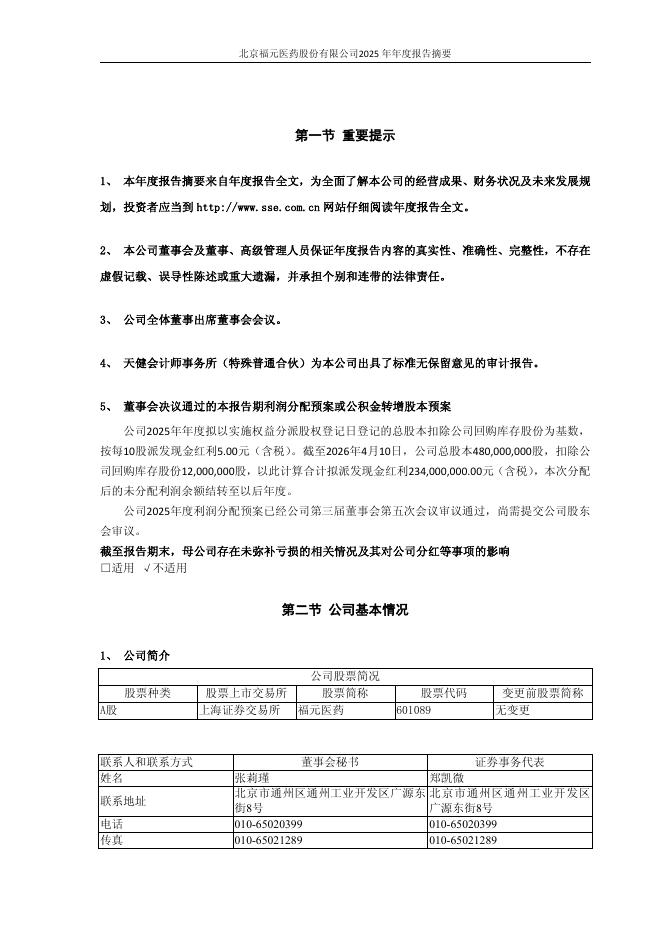 601089-福元医药:北京福元医药股份有限公司2025年年度报告摘要.pdf