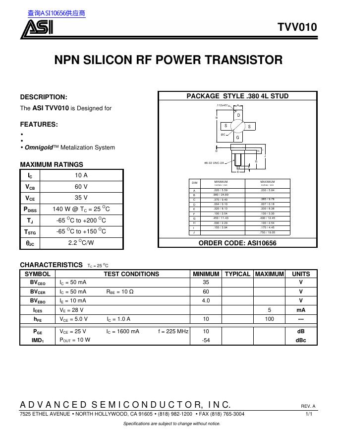NPN SILICON RF POWER TRANSISTOR TVV010 数据手册.pdf