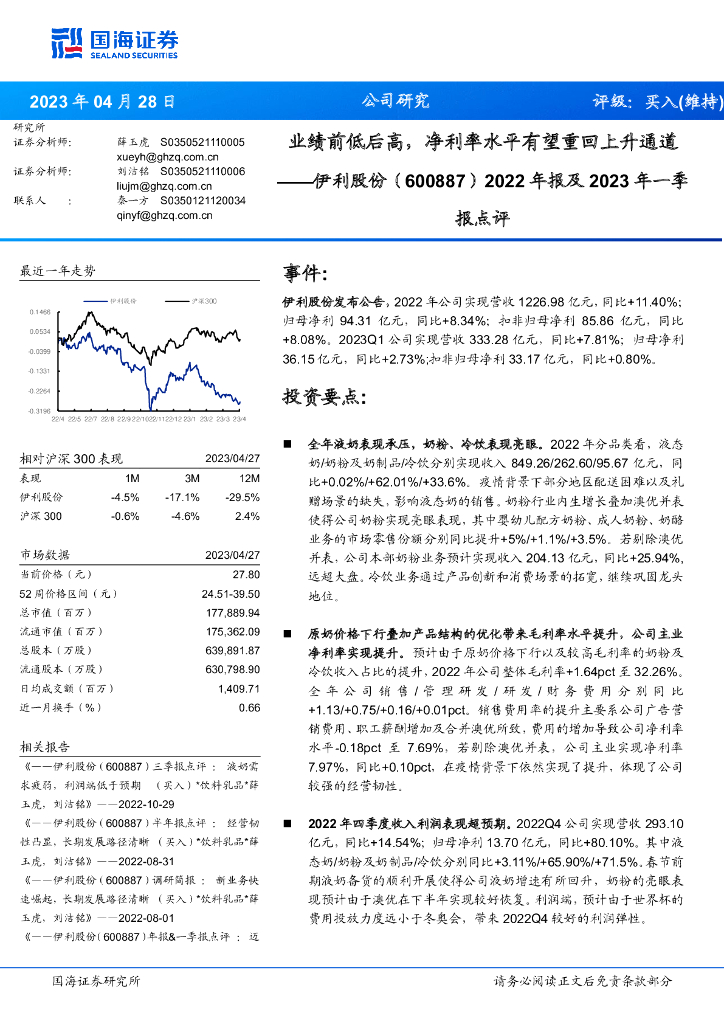 国海证券:伊利股份(600887)-2022年报及2023年一季报点评:业绩前低后高,净利率水平有望重回上升通道.pdf