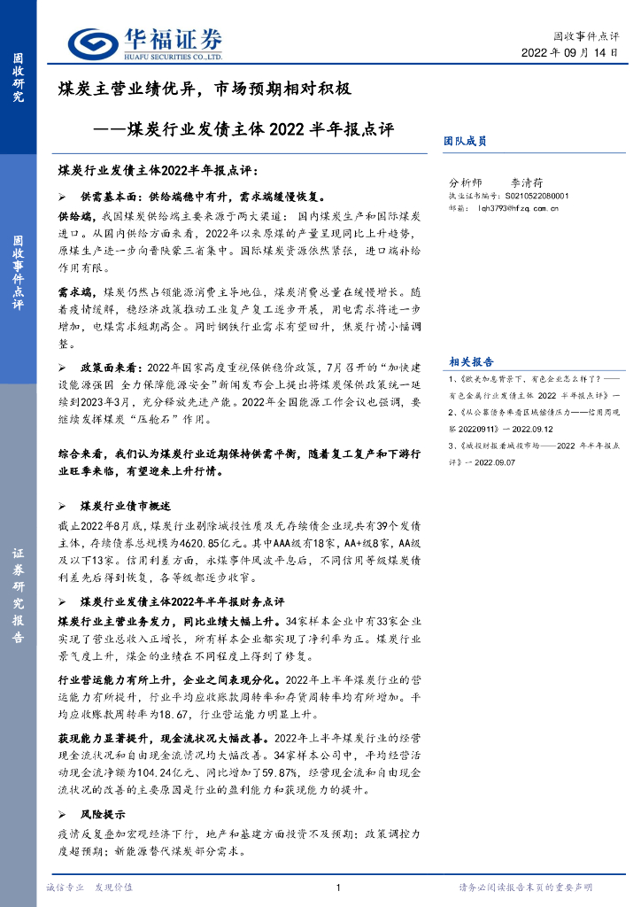 华福证券:煤炭行业发债主体2022半年报点评:煤炭主营业绩优异,市场预期相对积极.pdf