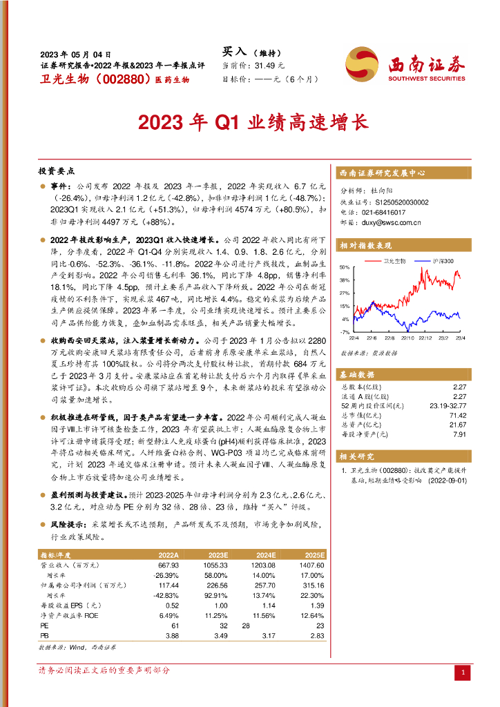 西南证券:卫光生物(002880)-2023年Q1业绩高速增长.pdf