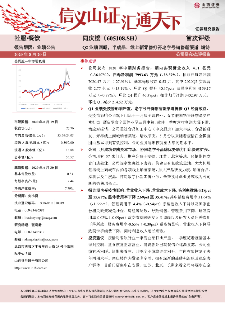山西证券:同庆楼(605108)-Q2业绩回暖,半成品、线上新零售打开老字号销售新渠道.pdf