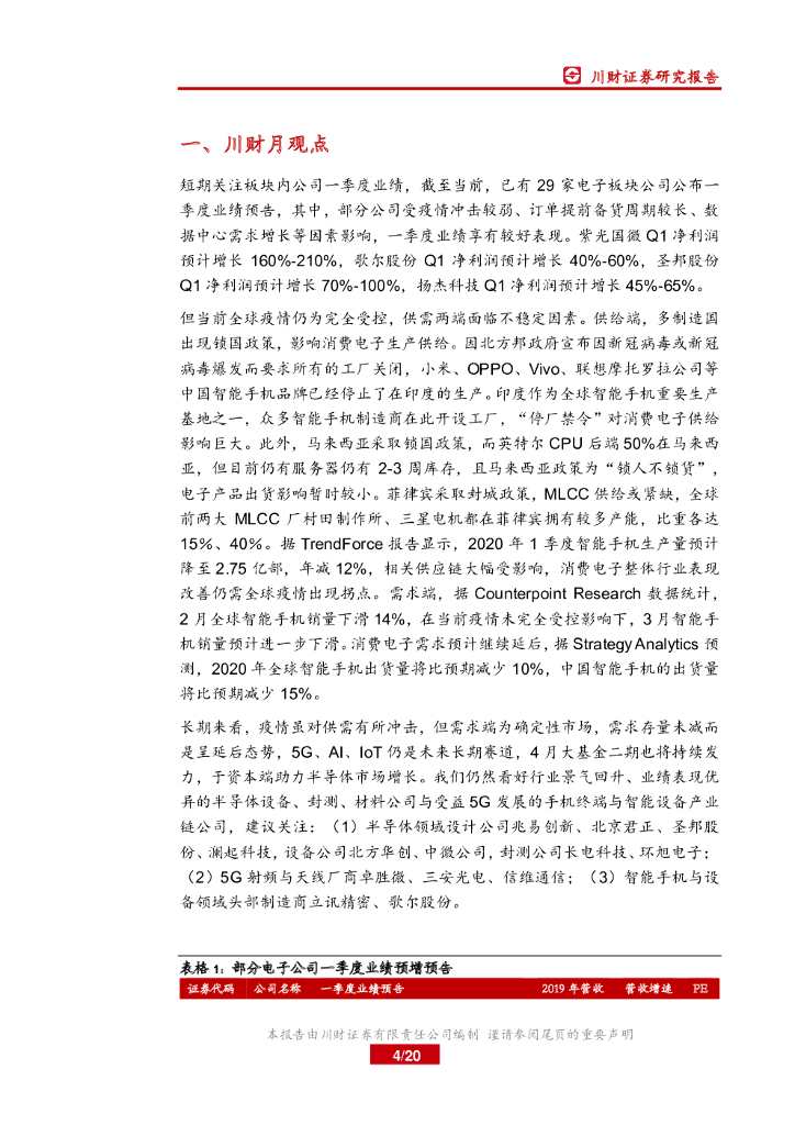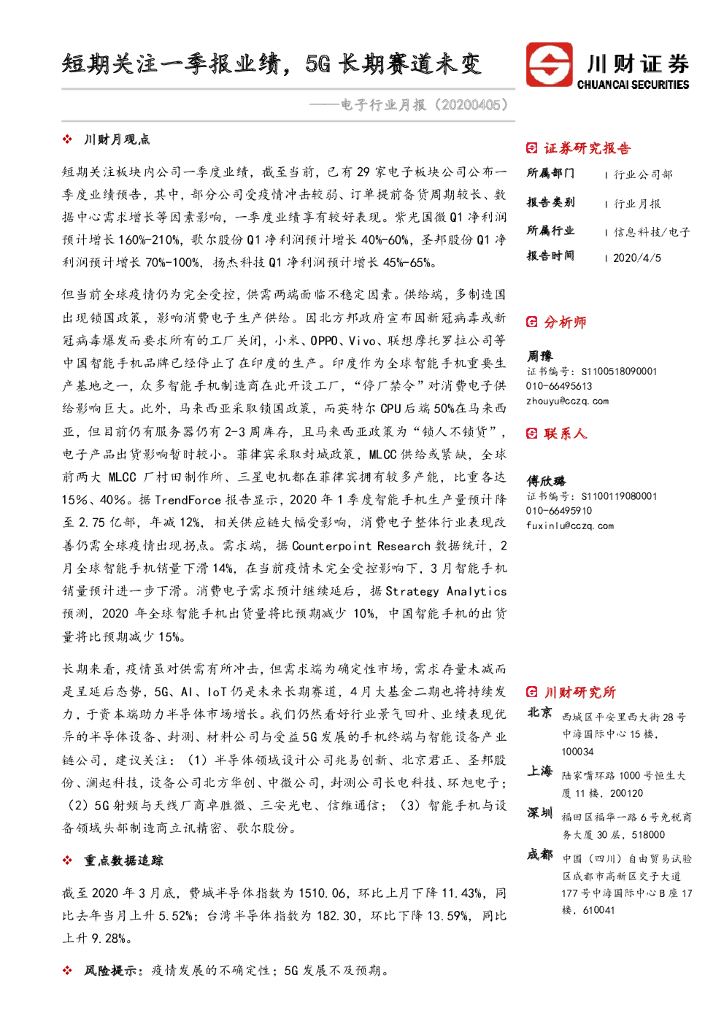 川财证券:电子行业月报:短期关注一季报业绩,5G长期赛道未变.pdf