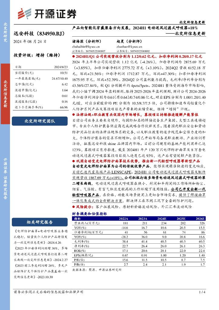开源证券:迅安科技(834950)-北交所信息更新诸海滨(分析师)赵昊(分析师):产品向智能化穿戴装备方向发展,2024H1电动送风过滤式呼吸器+18%.pdf