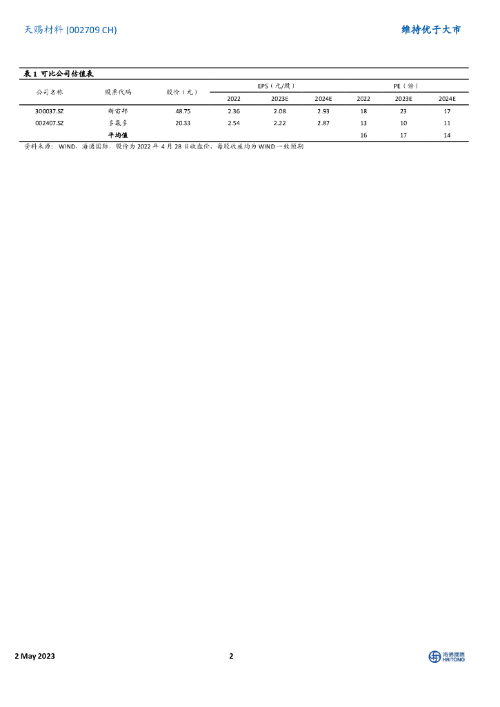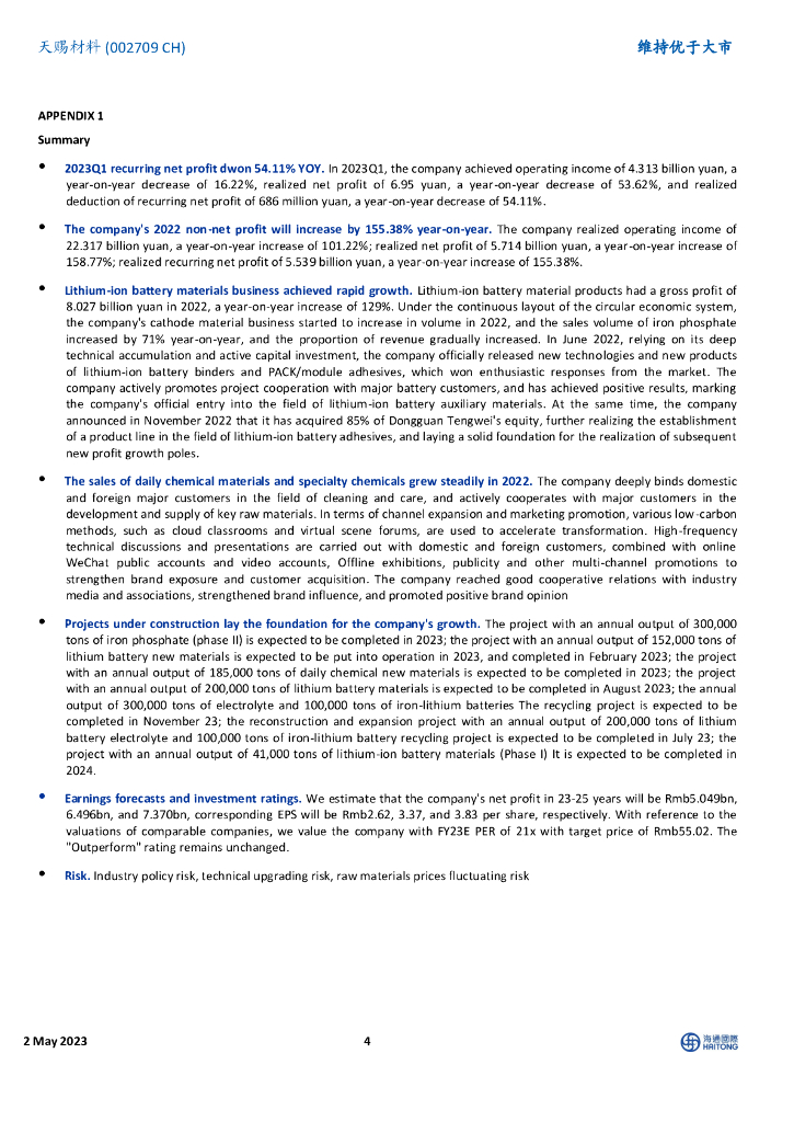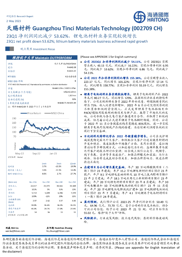海通国际:天赐材料(002709)-23Q1净利润同比减少53.62%,锂电池材料业务实现较快增长.pdf