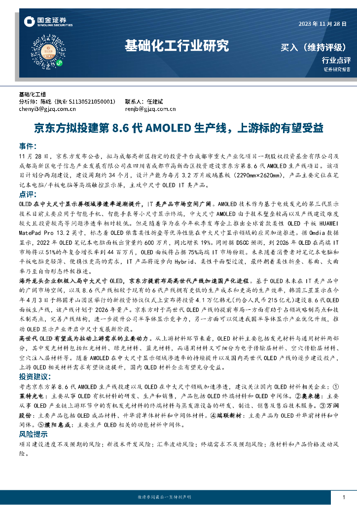 国金证券:基础化工行业研究:京东方拟投建第8.6代AMOLED生产线,上游标的有望受益.pdf