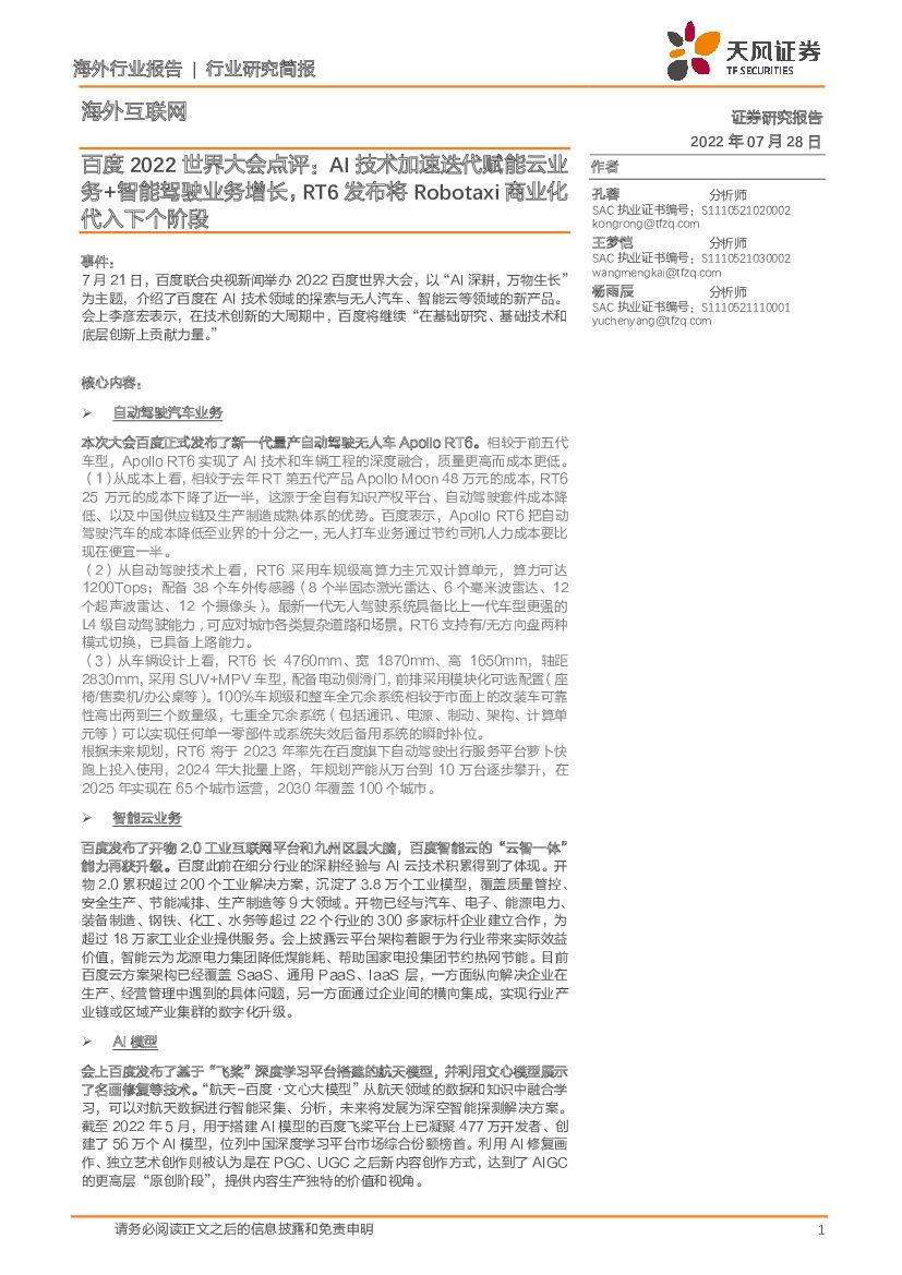 天风证券:百度2022世界大会点评:AI技术加速迭代赋能云业务+智能驾驶业务增长,RT6发布将Robotaxi商业化代入下个阶段.pdf