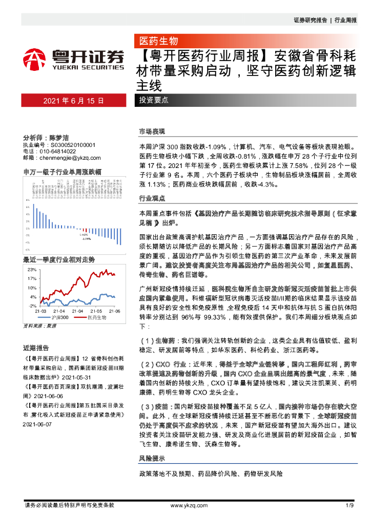 粤开证券:医药行业周报:安徽省骨科耗材带量采购启动,坚守医药创新逻辑主线.pdf