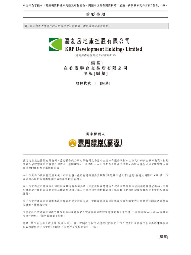 KRP嘉创房地产港交所IPO上市招股说明书:土储仅20万方,毛利率75.3%.pdf