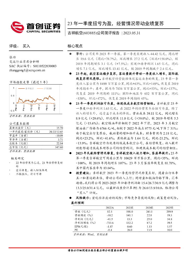 首创证券:吉祥航空(603885)-公司简评报告:23年一季度扭亏为盈,经营情况带动业绩复苏.pdf
