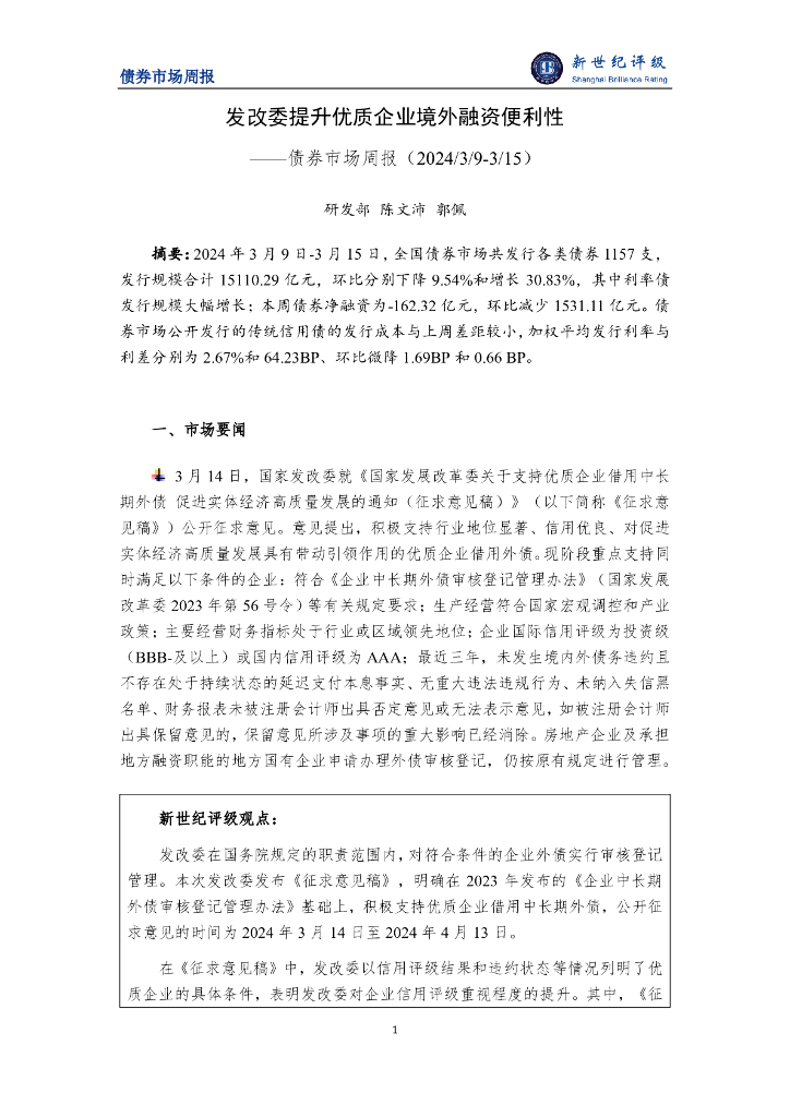 新世纪评级:发改委提升优质企业境外融资便利性——债券市场周报(2024/3/9-3/15).pdf