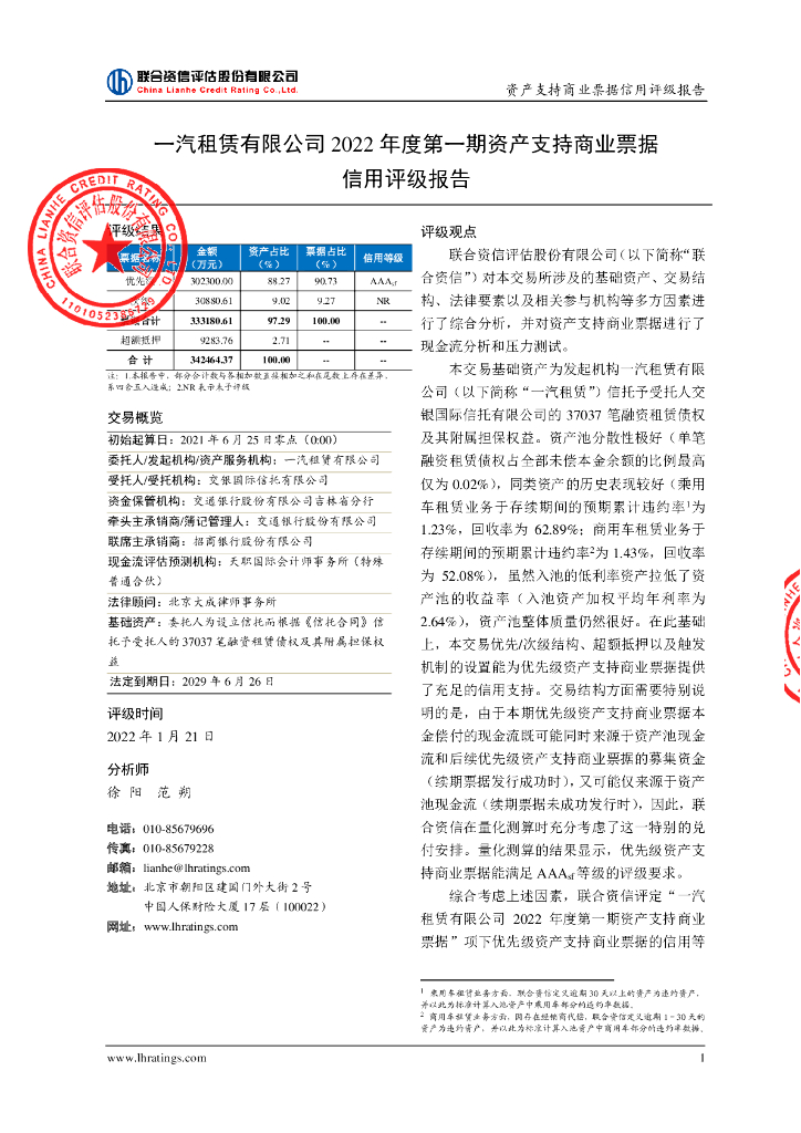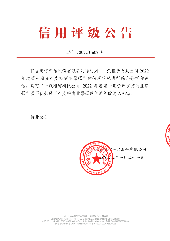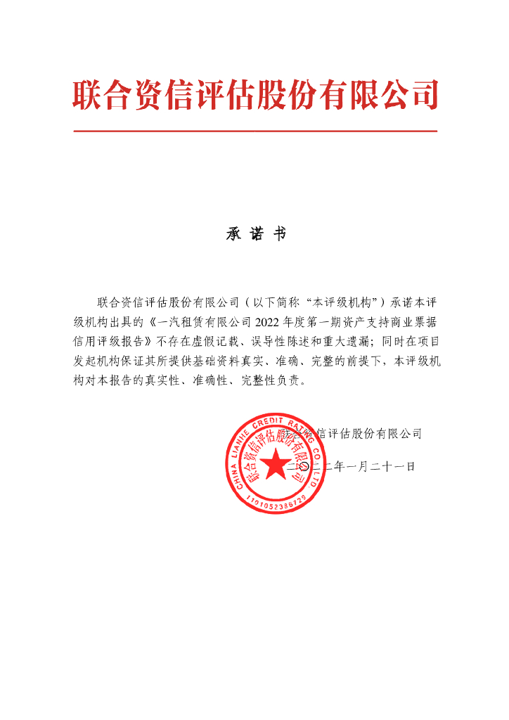 联合资信:一汽租赁有限公司2022年度第一期资产支持商业票据信用评级报告.pdf