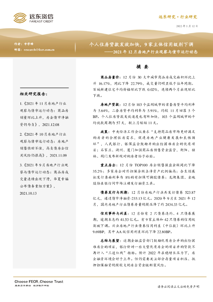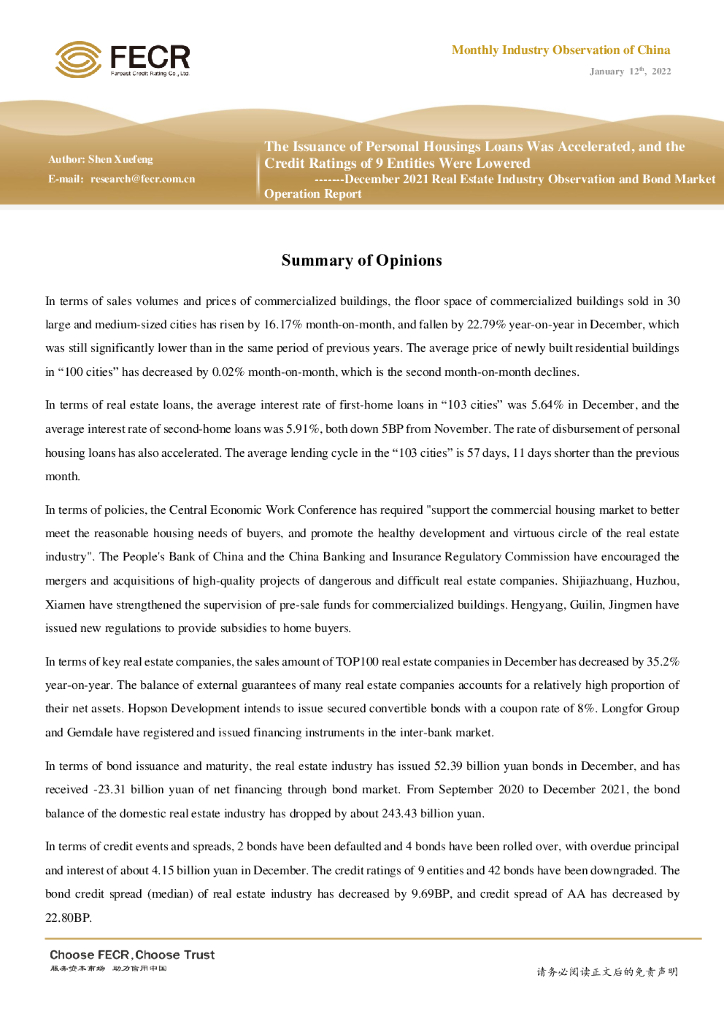 远东资信:2021年12月房地产行业观察与债市运行动态:个人住房贷款发放加快,9家主体信用级别下调.pdf