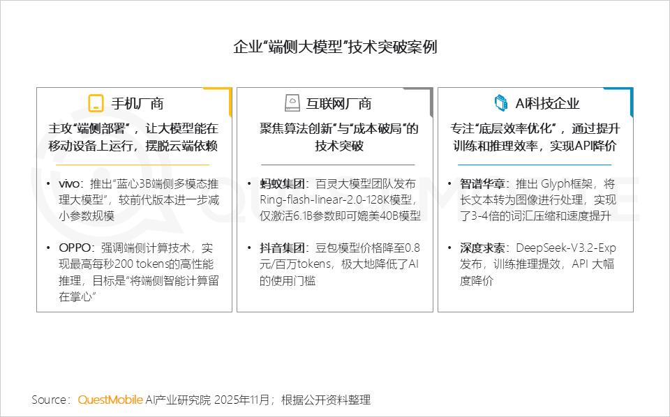3、手机厂商夯实端侧根基,互联网、AI科技企业通过算法创新和效率优化,让AI应用更经济可行;三方合力,共同推动AI从云端向终端加速落地