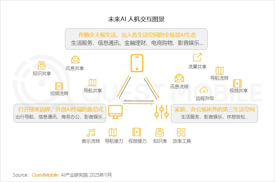 今天给大家分享一下AI终端产业发展趋势洞察。QuestMobile数据显示,2025年初以来,随着技术突破,以及国产算力芯片的持续突围,轻量化、低成本的端侧部署快速发力,叠加政策引领的作用,使得用户端对智能化的需求持续爆发,形成了基于场景化适配模式下的应用层爆发:围绕AI手机和AI PC形成了AI可穿戴设备的“智慧生活模型”,并在此基础上,形成了智能家居和智能汽车两大“智能空间”,为新兴的具身智能以及未来的空间智能带来了清晰可见的应用曙光!