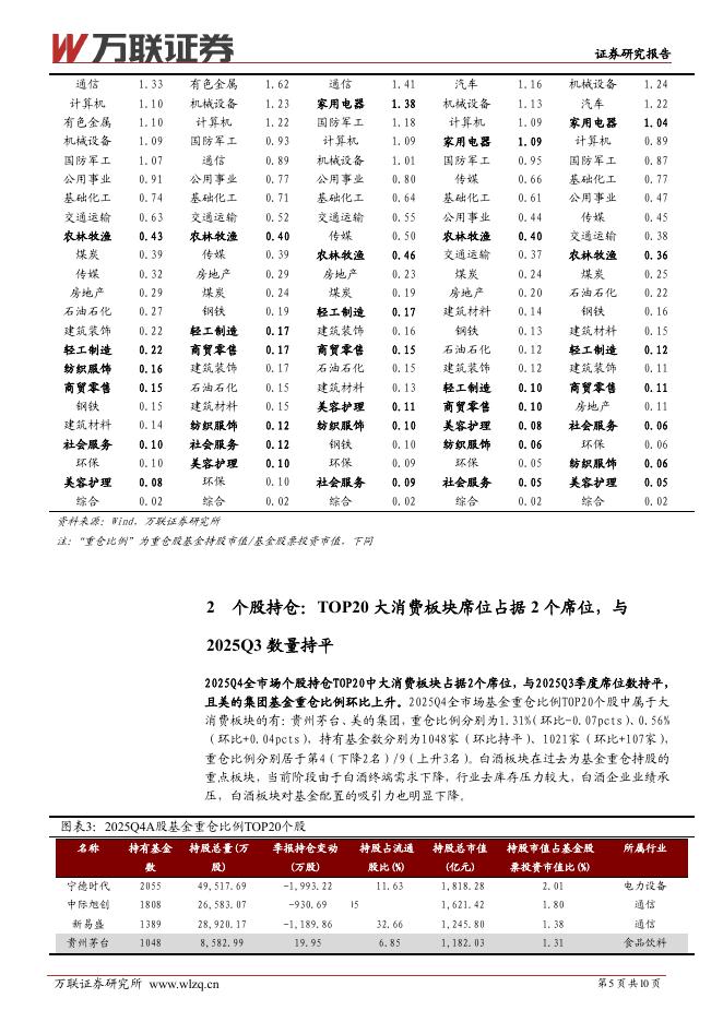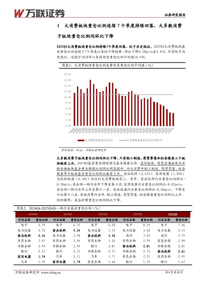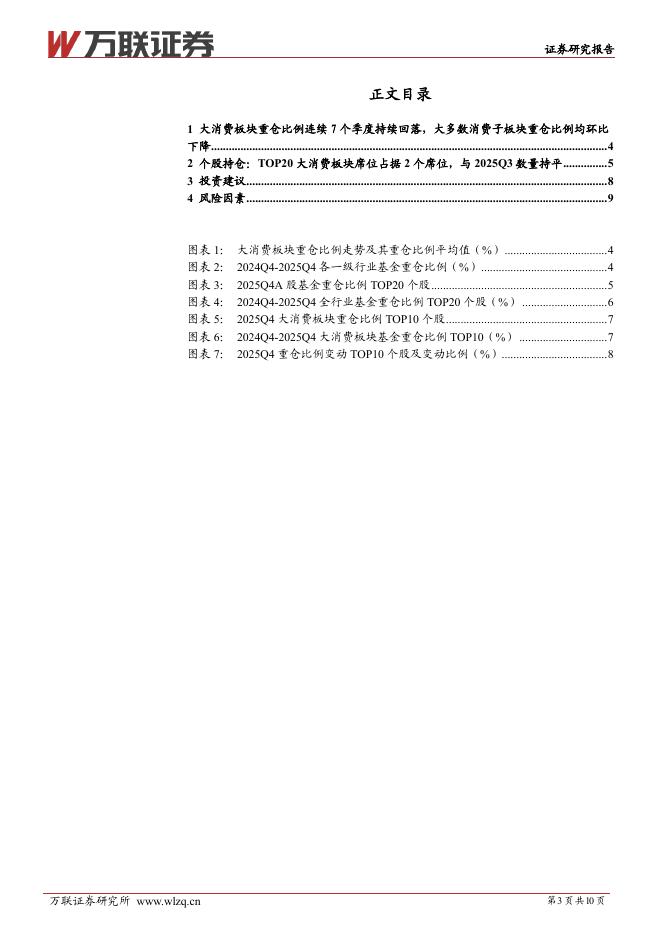 万联证券:大消费行业2025Q4基金持仓分析:大消费板块重仓比例连续7个季度回落,远低于历史均值水平.pdf