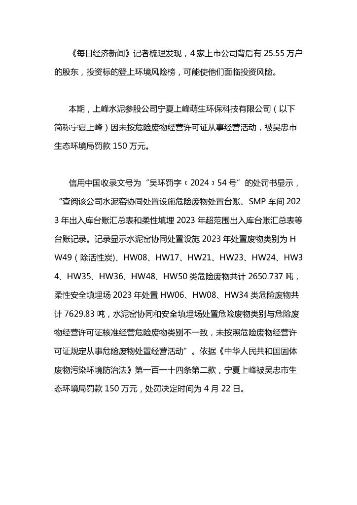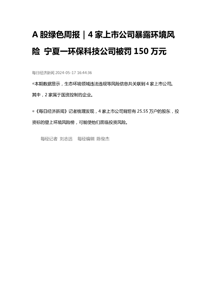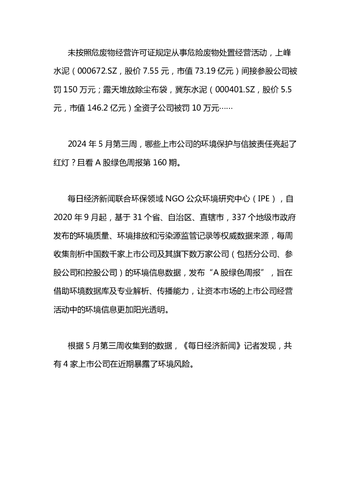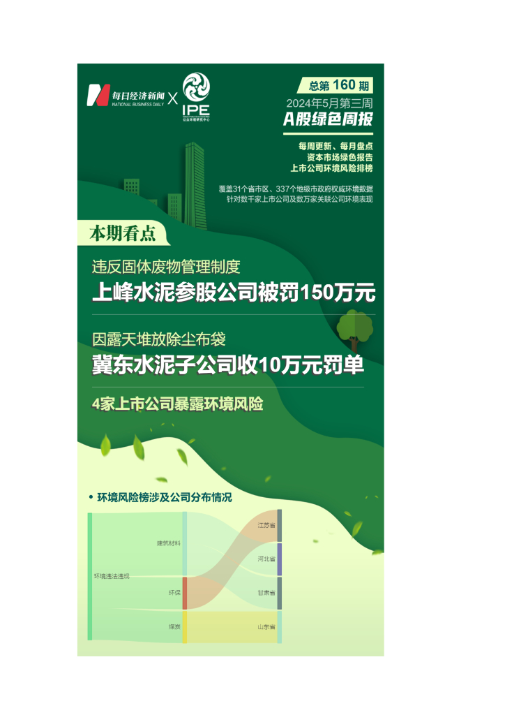 IPE公众环境研究中心:A股绿色周报(2024年5月第三周 总第160期):4家上市公司暴露环境风险 宁夏一环保科技公司被罚150万元.pdf