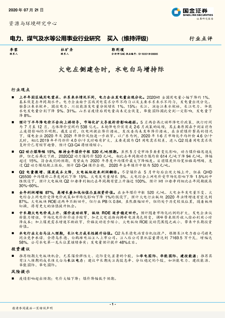 国金证券:电力、煤气及水等公用事业行业研究:火电左侧建仓时,水电白马增持际.pdf