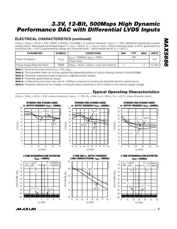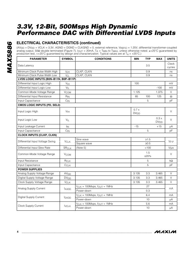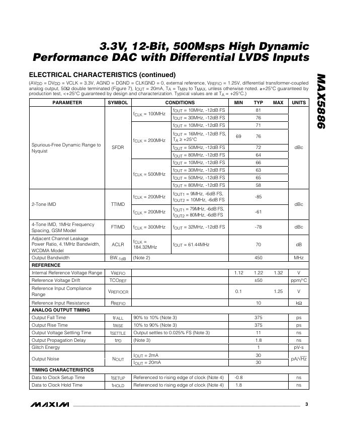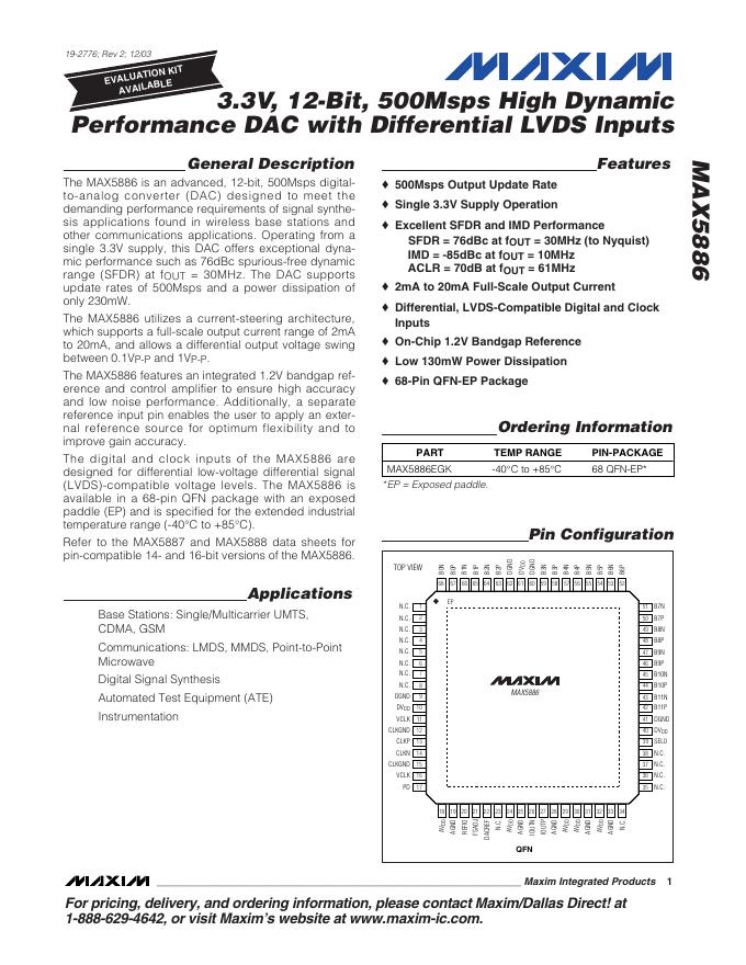 MAXIM MAX5886 3.3V, 12-Bit, 500Msps High Dynamic Performance DAC with Differential LVDS Inputs 数据手册.pdf