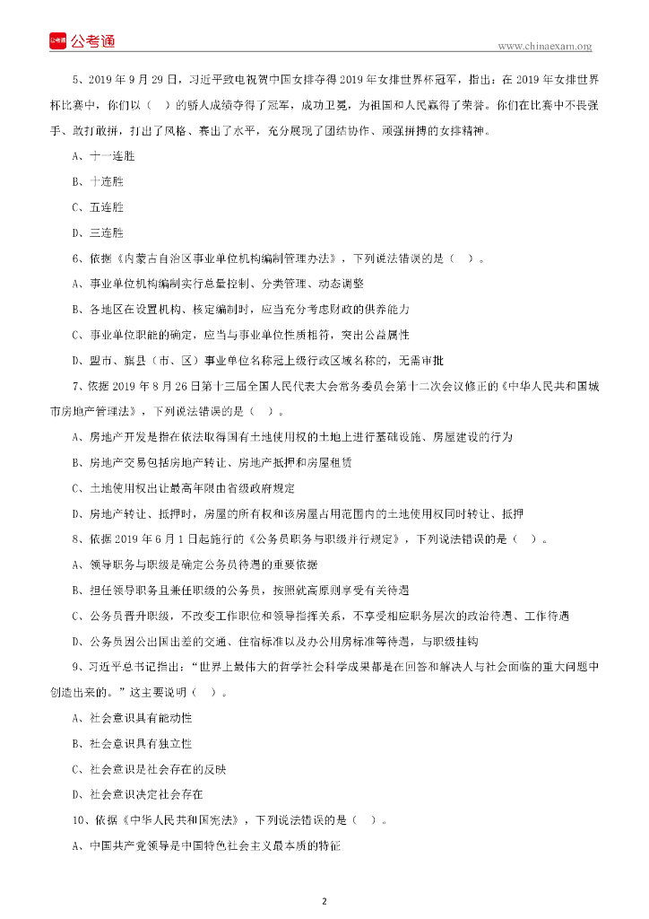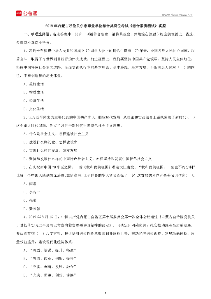 2019年内蒙古呼伦贝尔市事业单位考试综合类岗位《综合素质测试》真题.pdf