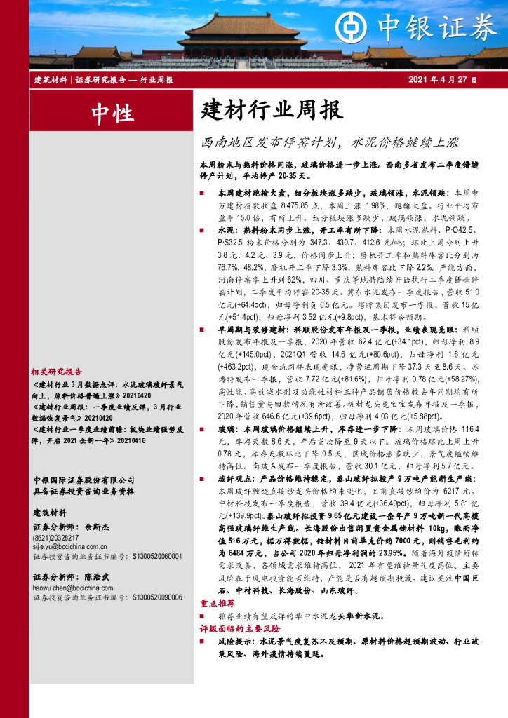 中银证券:建材行业周报:西南地区发布停窑计划,水泥价格继续上涨.pdf