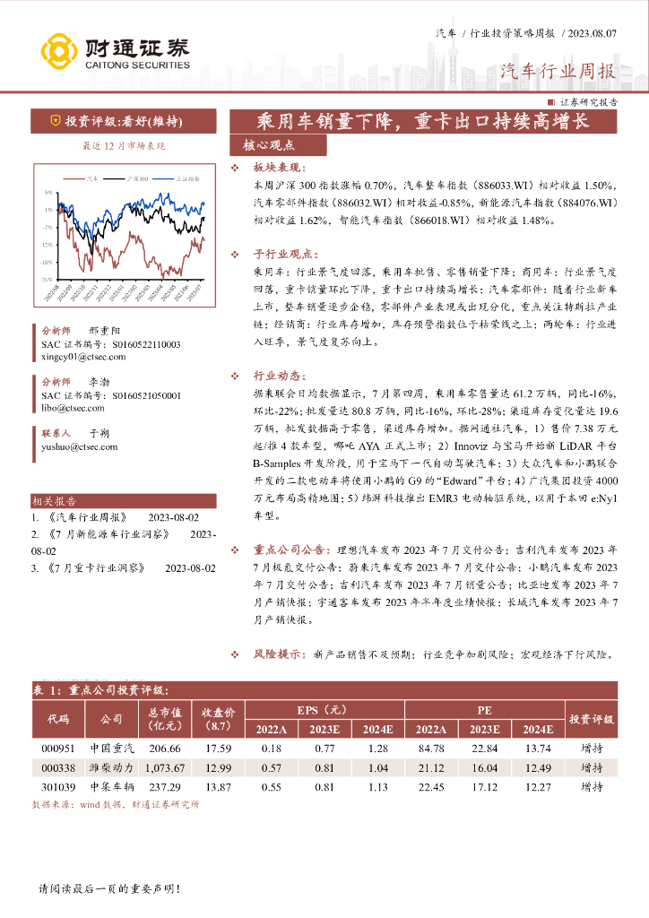 财通证券:汽车行业投资策略周报:乘用车销量下降,重卡出口持续高增长.pdf