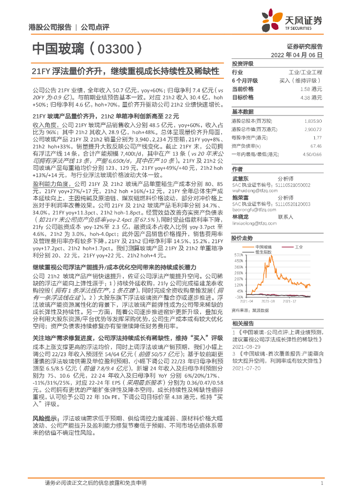天风证券:中国玻璃(03300)港股公司研究报告-21FY浮法量价齐升,继续重视成长持续性及稀缺性.pdf