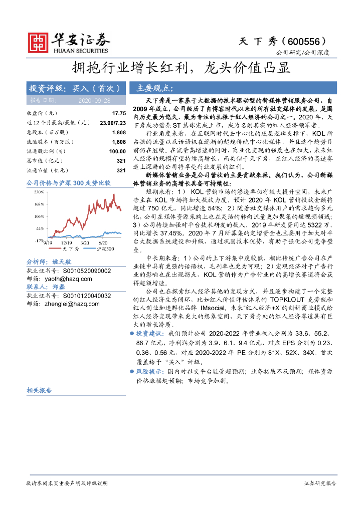 华安证券:天下秀(600556)-拥抱行业增长红利,龙头价值凸显.pdf