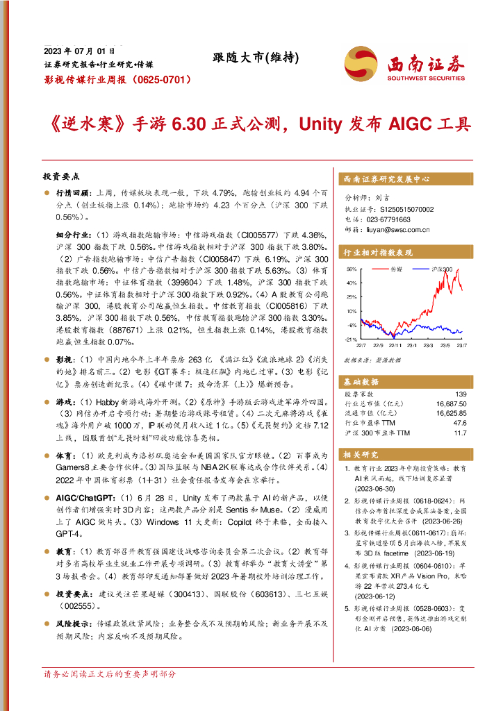 西南证券:影视传媒行业周报:《逆水寒》手游6.30正式公测,Unity发布AIGC工具.pdf