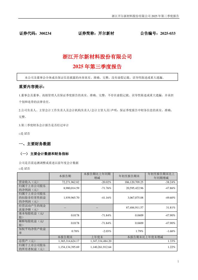 300234-开尔新材:2025年三季度报告.pdf