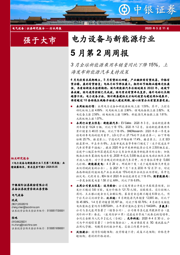 中银证券:电力设备与新能源行业5月第2周周报:3月全球新能源乘用车销量同比下降15%,上海发布新能源汽车支持政策.pdf