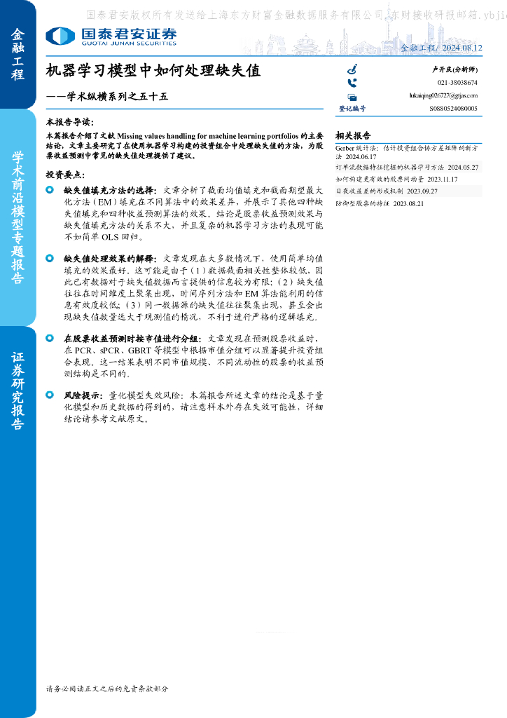 国泰君安:学术纵横系列之五十五:机器学习模型中如何处理缺失值.pdf
