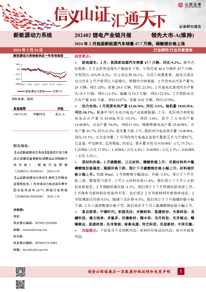 山西证券:锂电产业链月报:2024年2月我国新能源汽车销量47.7万辆,碳酸锂价格上涨.pdf