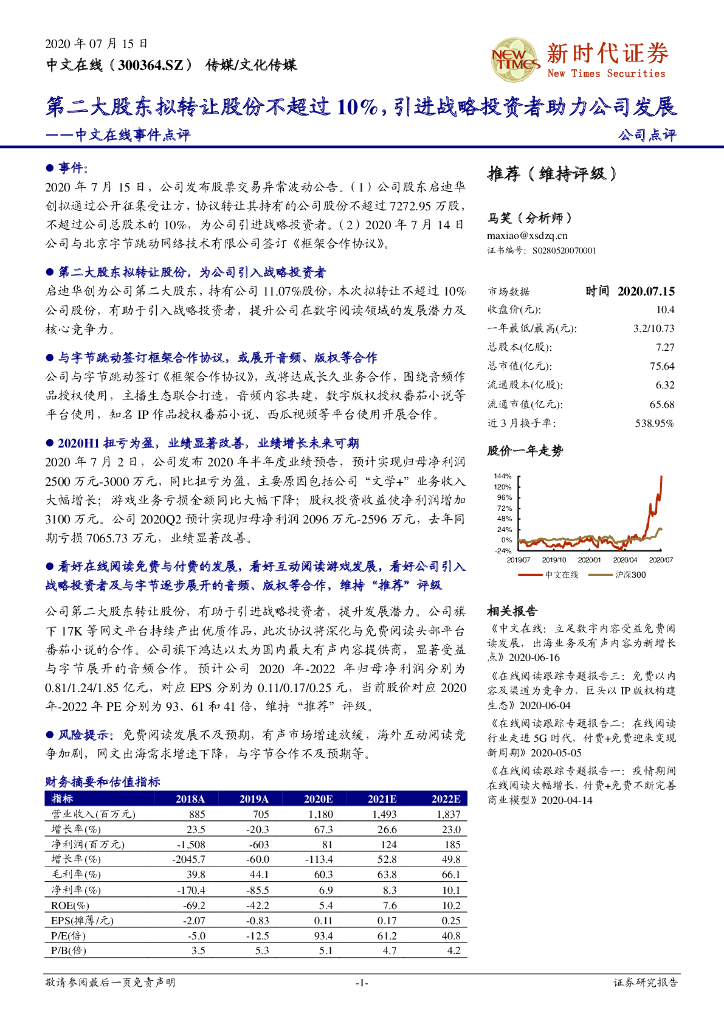 新时代证券:中文在线事件点评:第二大股东拟转让股份不超过10%,引进战略投资者助力公司发展.pdf