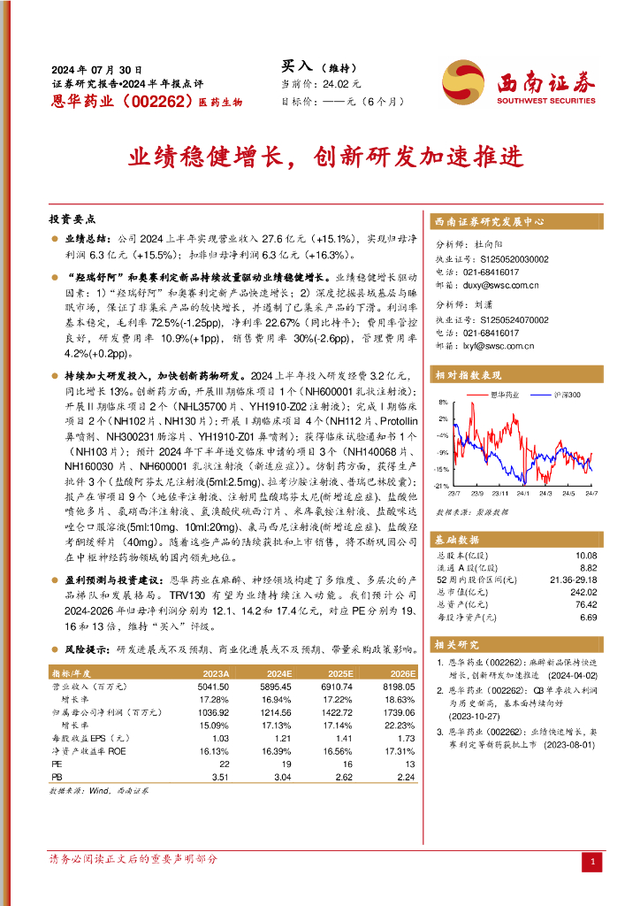 西南证券:恩华药业(002262)-业绩稳健增长,创新研发加速推进.pdf