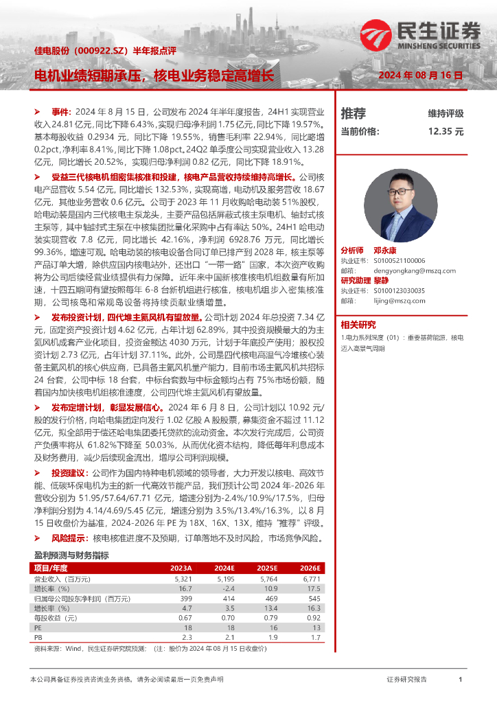 民生证券:佳电股份(000922)-半年报点评:电机业绩短期承压,核电业务稳定高增长.pdf