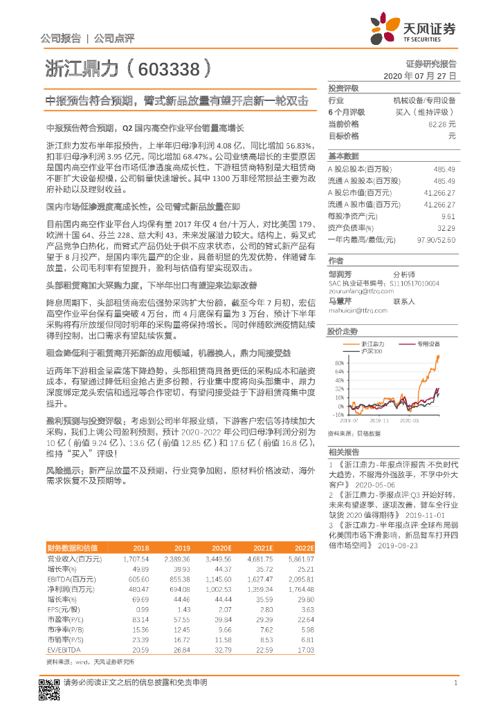 天风证券:浙江鼎力(603338)-中报预告符合预期,臂式新品放量有望开启新一轮双击.pdf