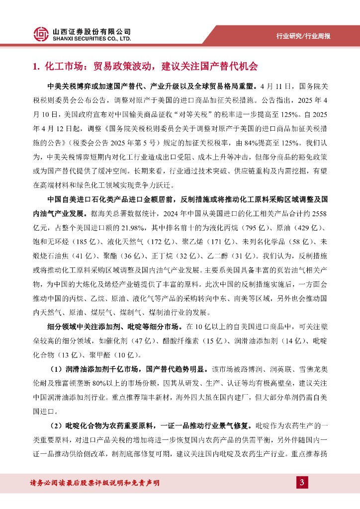山西证券:基础化工行业周报:行业周报(20250407-0413)关税博弈持续演绎,看好国产替代及景气修复板块.pdf