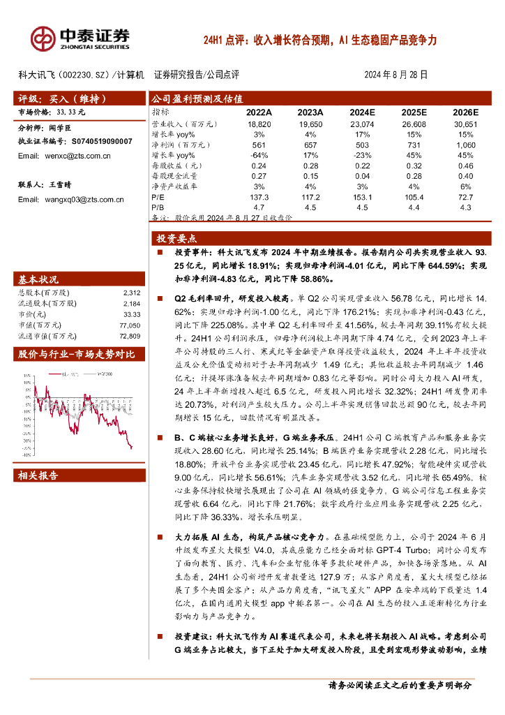 中泰证券:科大讯飞(002230)-24H1点评:收入增长符合预期,AI生态稳固产品竞争力.pdf