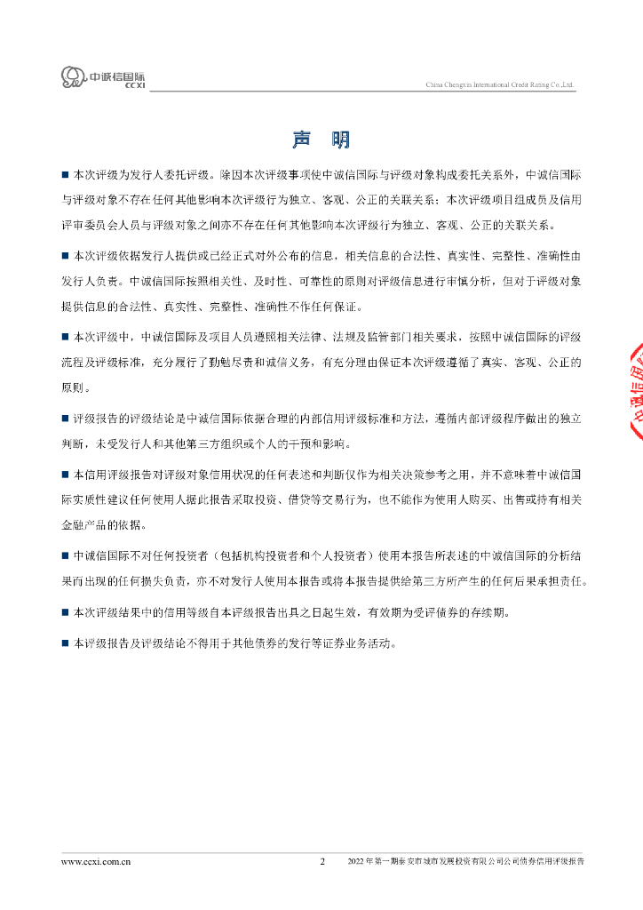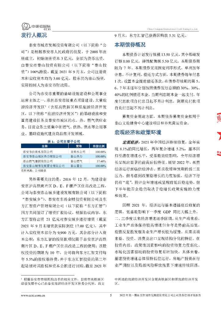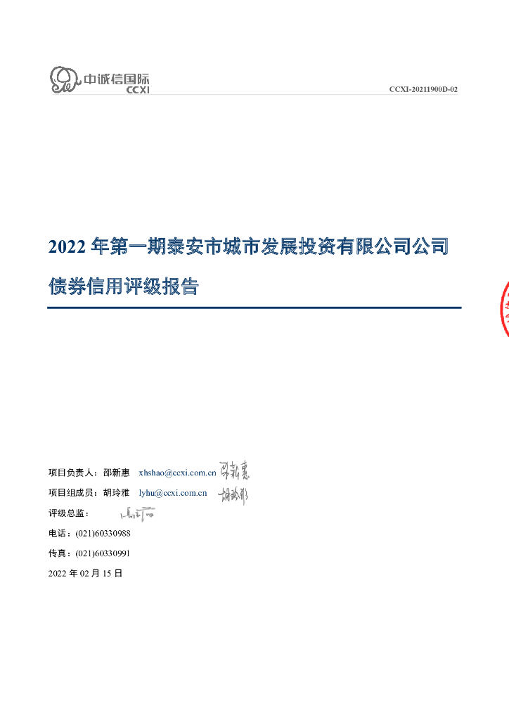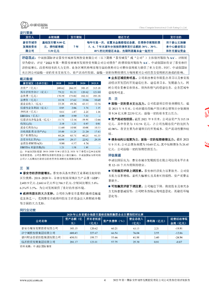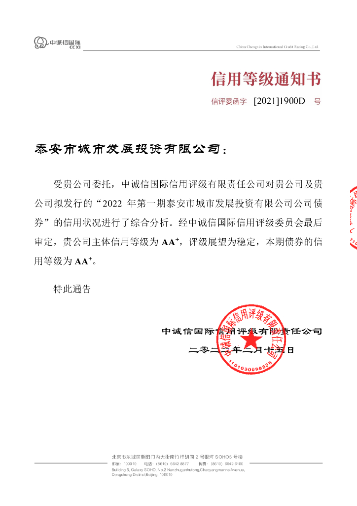 中诚信:2022年第一期泰安市城市发展投资有限公司公司债券信用评级报告.pdf