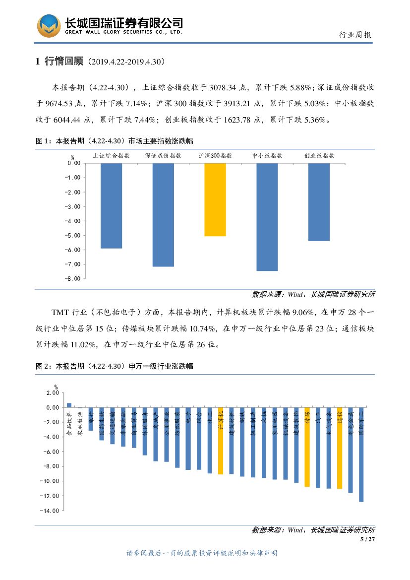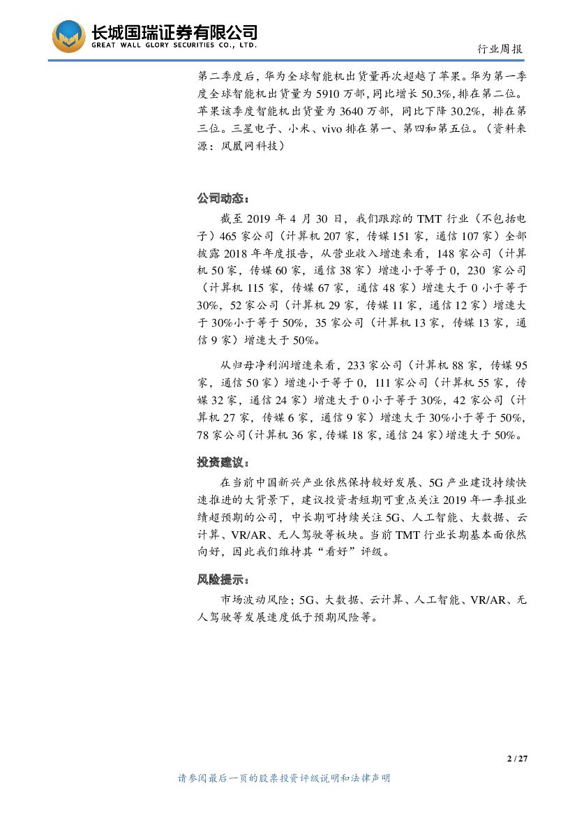 长城国瑞证券:TMT行业双周报2019年第9期(总第68期):2019年一季度互联网企业收入同比增17.3%,单季度华为手机出货量再次超越苹果.pdf