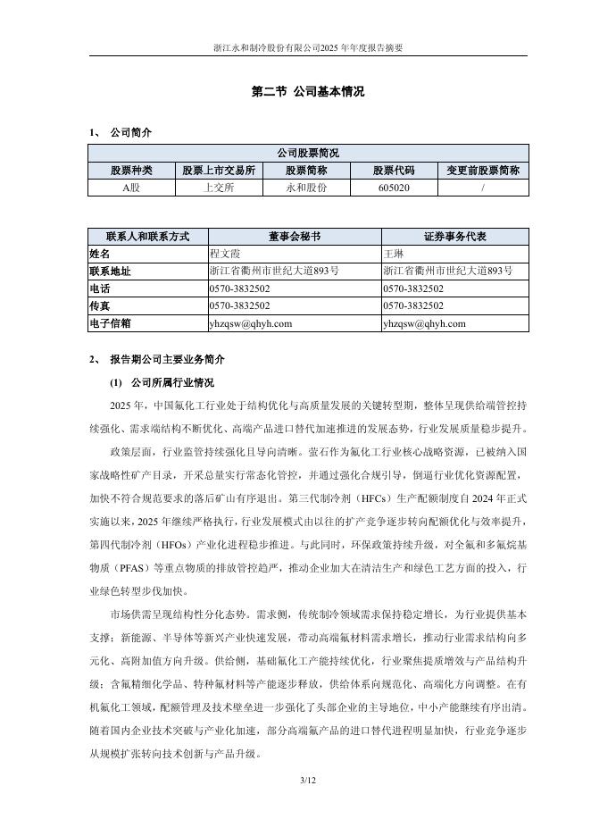 605020-永和股份:浙江永和制冷股份有限公司2025年年度报告摘要.pdf