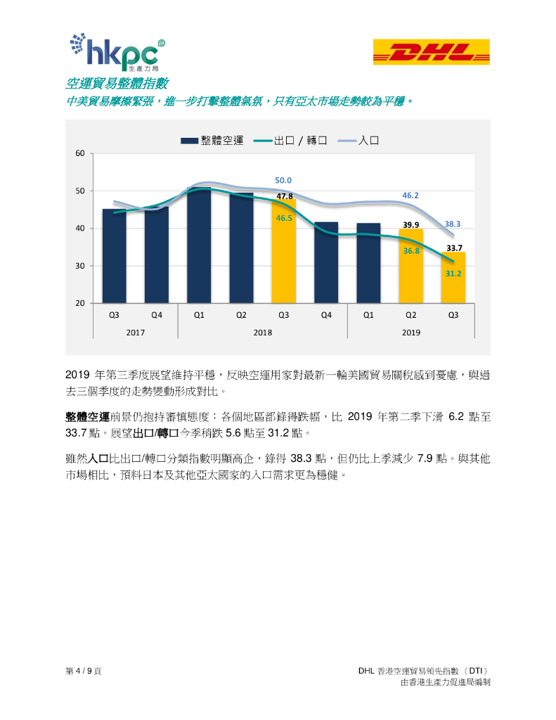 香港生产力促进局:2019年第三季度DHL香港空运贸易领先指数(DTI)报告(繁体版).pdf