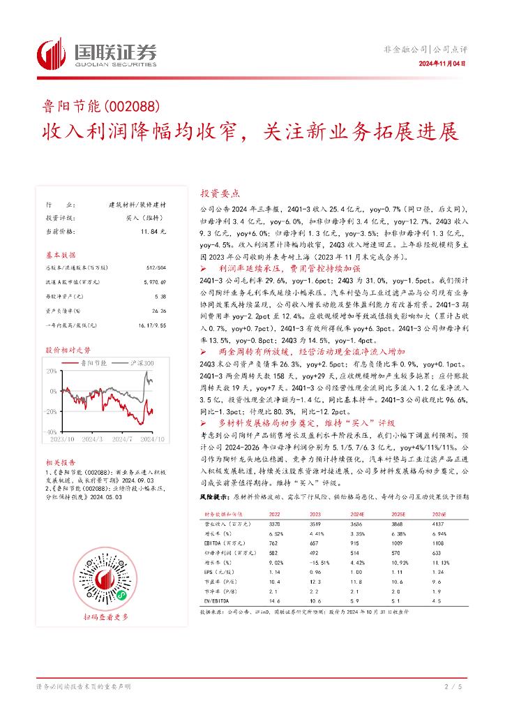 国联证券:鲁阳节能(002088)-收入利润降幅均收窄,关注新业务拓展进展.pdf