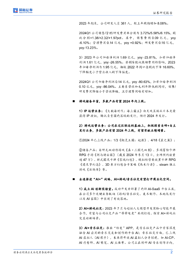 国海证券:盛天网络(300494)-2023年业绩承压,“AI+”战略持续深化,关注2024年游戏新品上线表现.pdf
