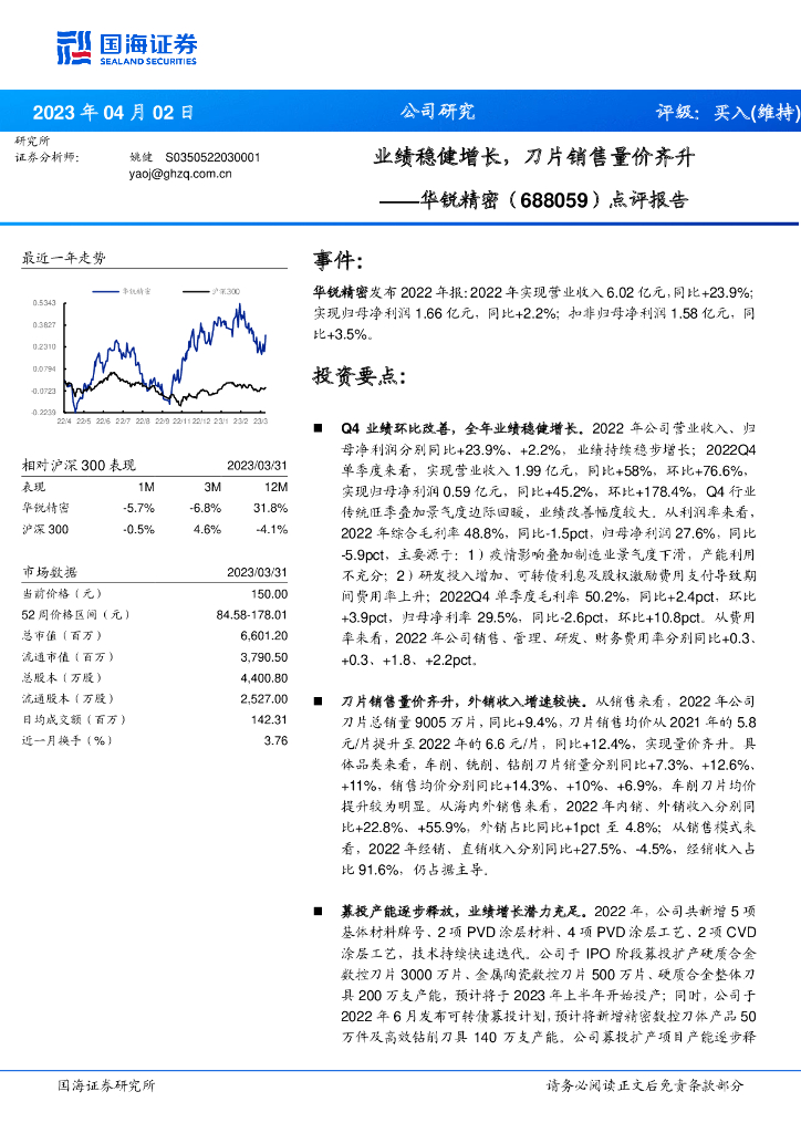 国海证券:华锐精密(688059)-点评报告:业绩稳健增长,刀片销售量价齐升.pdf