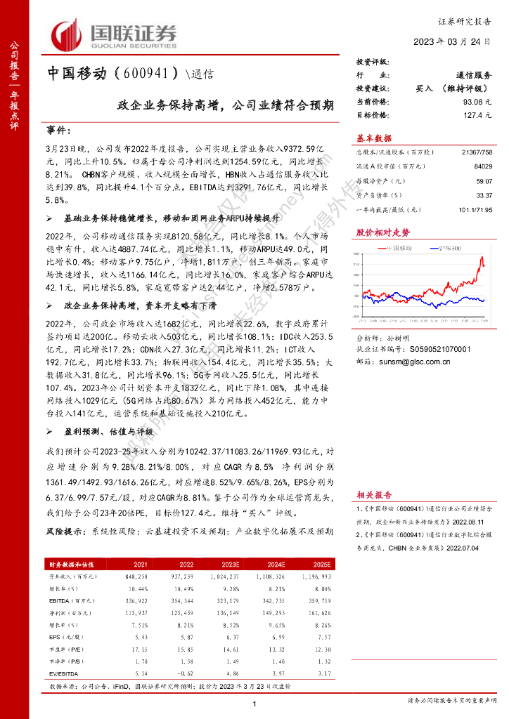 国联证券:中国移动(600941)-政企业务保持高增,公司业绩符合预期.pdf