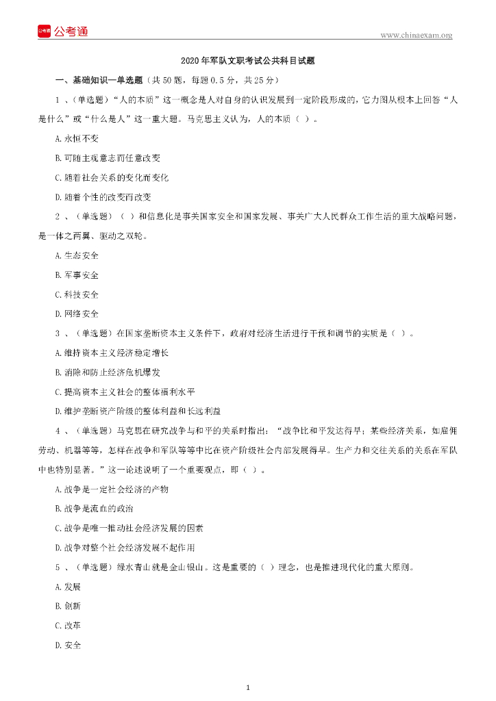 2020年军队文职考试公共科目试题及参考答案.pdf